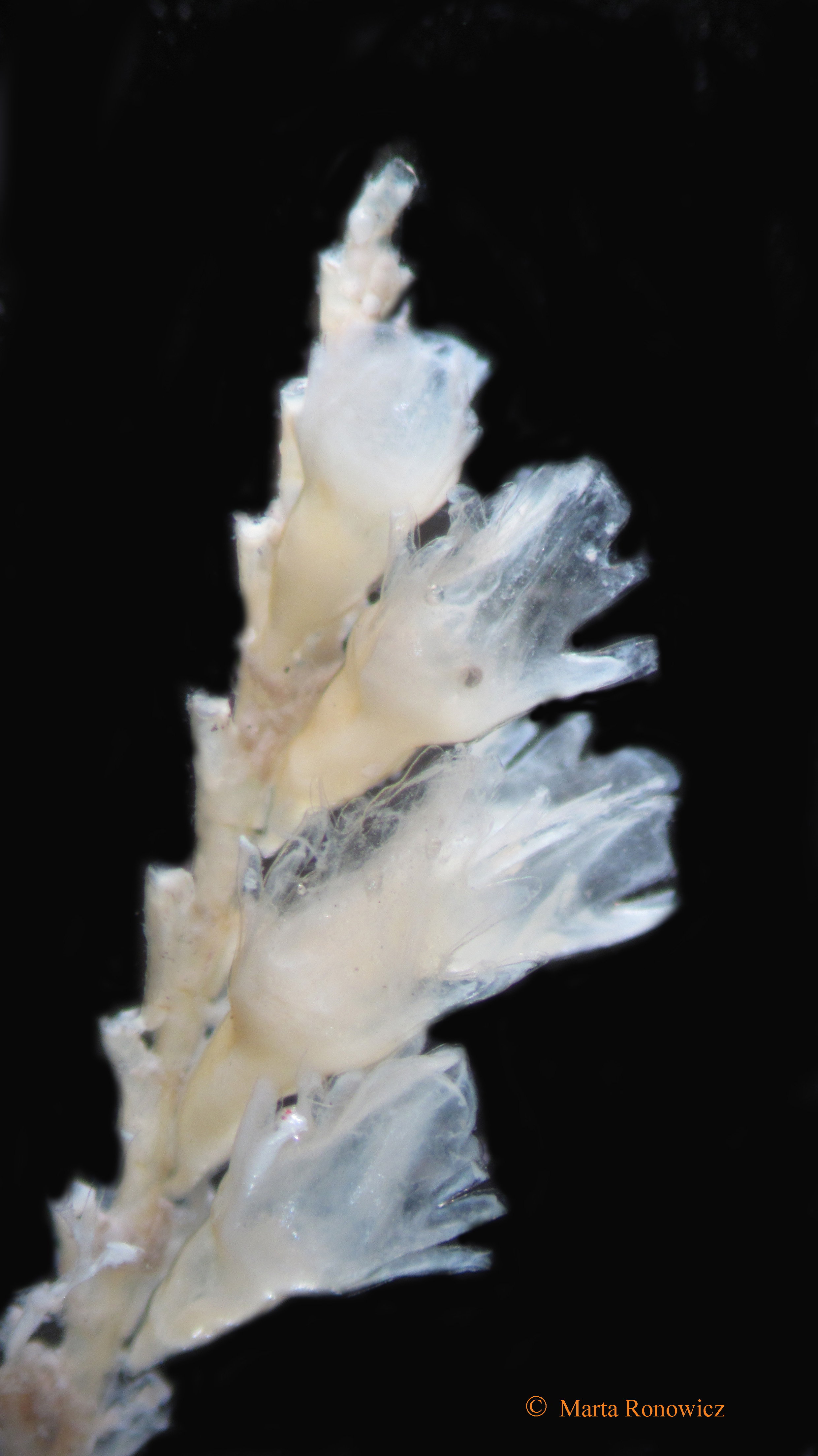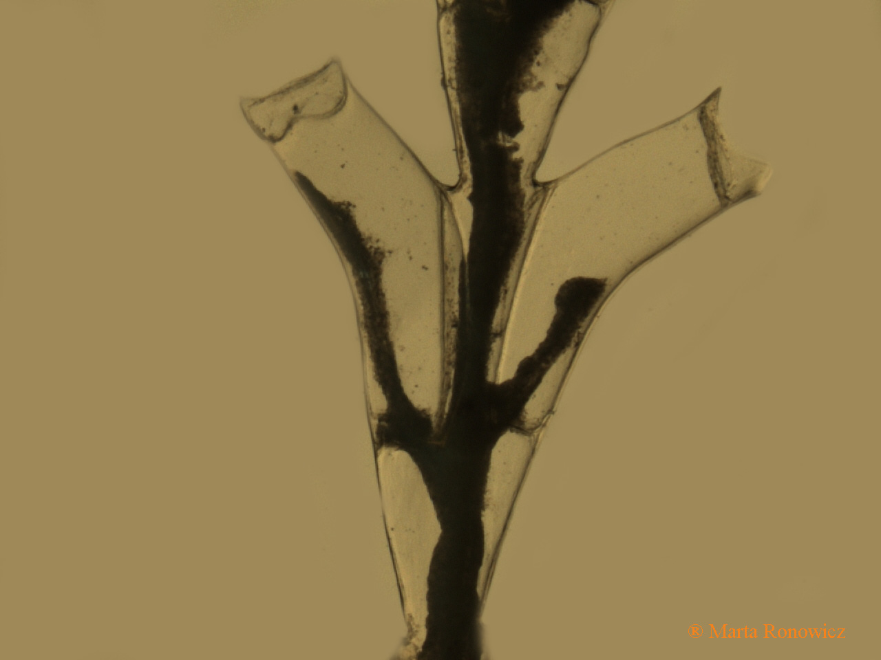 Erect, monosiphonic colony, branching in one plane (Fig.1). Hydrothecae very large, in